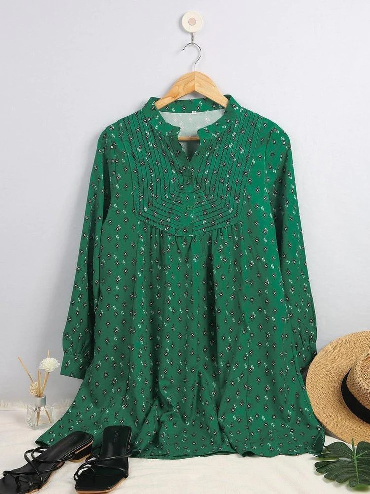 Vintage meets modern day on this emerald green foulard-print dress that’s perfect for work to weekend. The mini shirtdress has a classic A-line finish keeping the drama on the top with details like angled topstitching and feminine gathers. We love it with mod white booties. Neckline: V-Neck; Sleeve Length: Long Sleeve; Dress Length: Mini; Pattern Type: Print; 40% Elastane, 60% Rayon; Machine Washable; Loose-fitting.