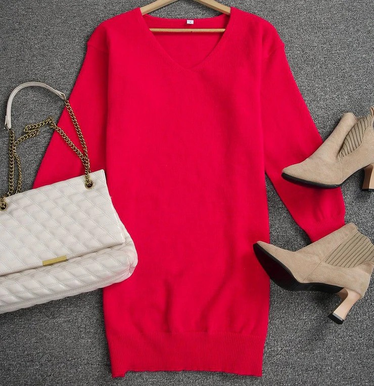 Neckline: V-neck; Sleeve Length: Long Sleeve; Pattern Type: Plain; Silhouette: Shift; Dress Length: Mini; Cotton/Acrylic; Machine Washable.
