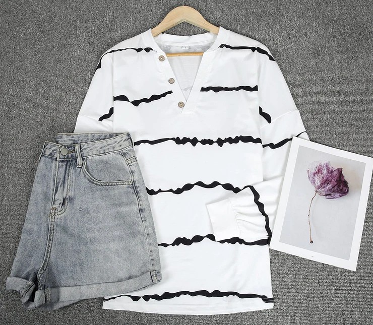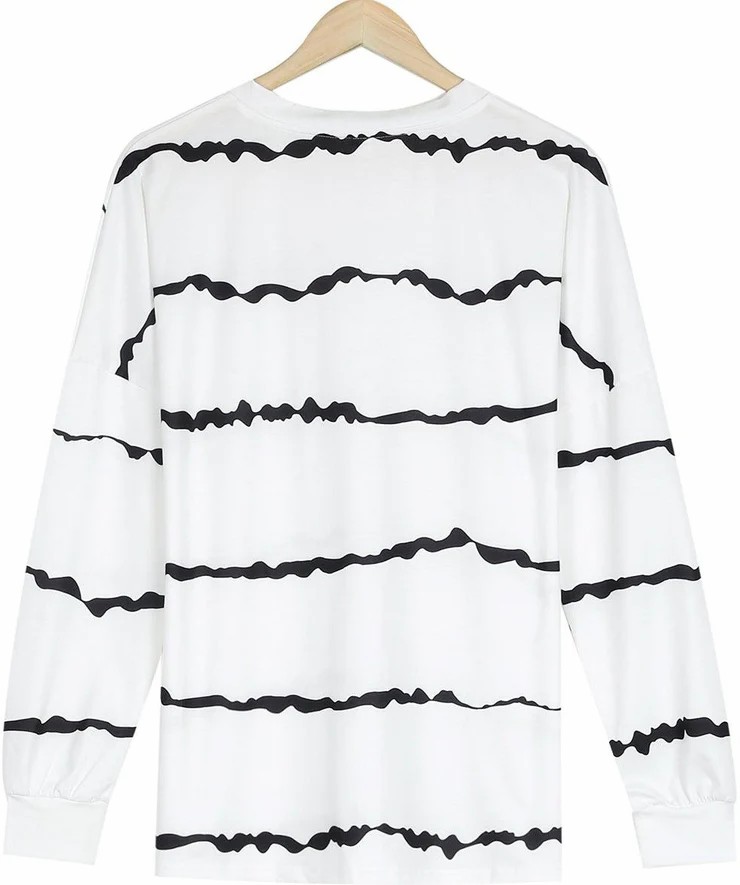 Neckline: V-neck; Sleeve Length: Long Sleeve; Pattern Type: Print; Silhouette: Shift; 65% Cotton, 35% Elastane; Machine Washable.